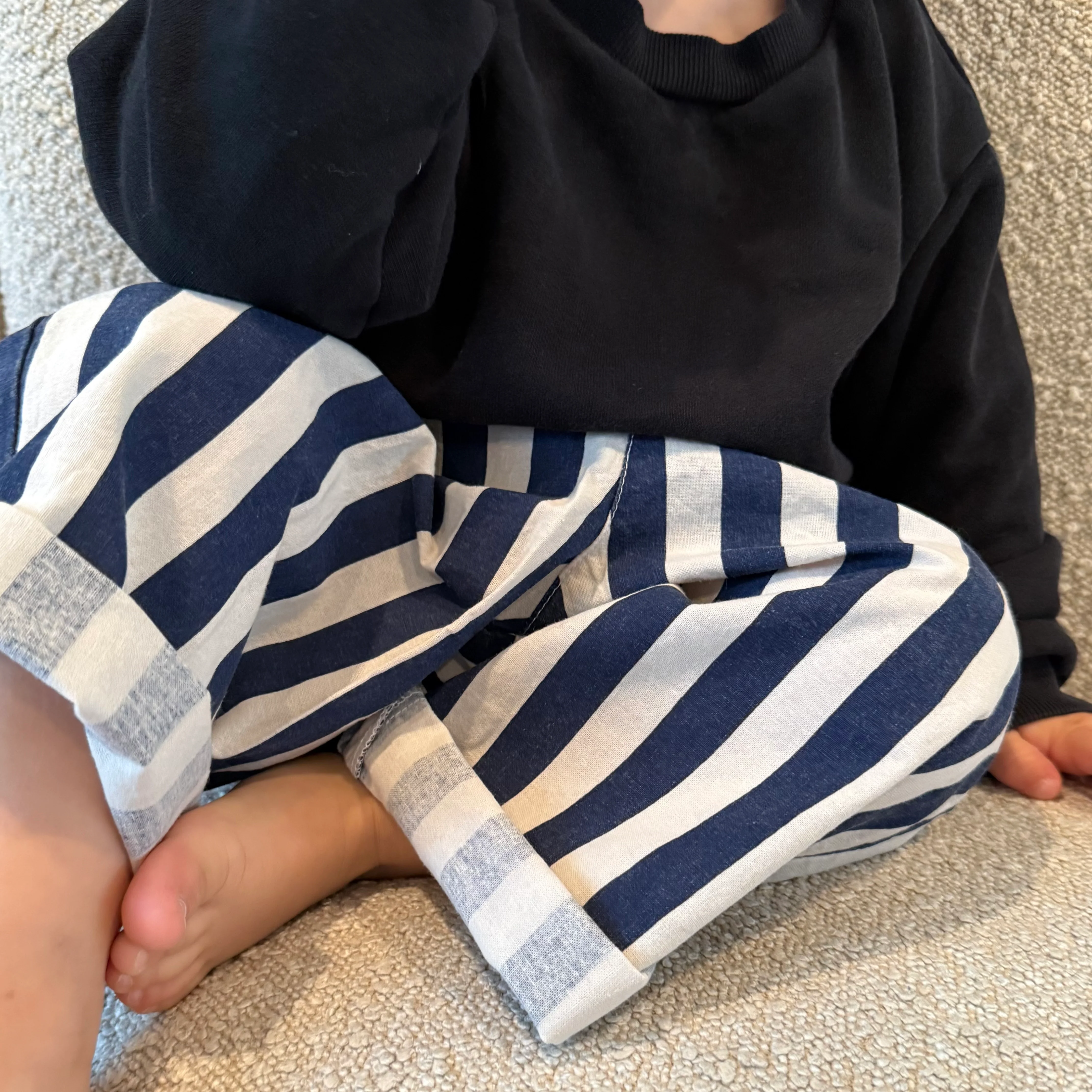 These wide leg stripe trousers are the ultimate in modern cool-kid style, tapering to a cropped ankle they're a versatile and comfortable staple pair of trousers. Loose and baggy, they have a comfortable wide elastic waistband, perfect for speedy dressing and little ones to pull up themselves.